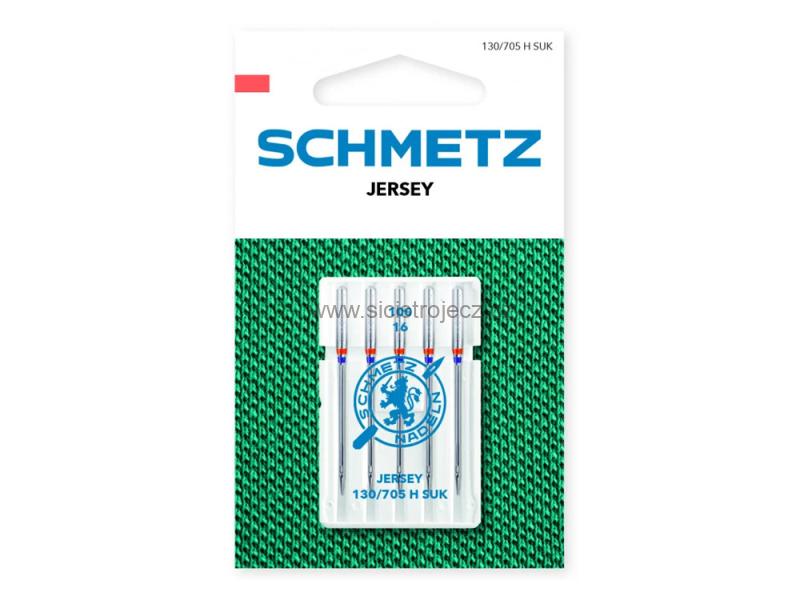 Univesální jehly SCHMETZ - 130/705H-SUK, 5ks síla 100. Jehly s kuličkou mají kulatější hrot, který zabraňuje tečení ok a trhání vláken úpletu, neboť prochází mezi vlákny.Pro lepší orientaci jehel pro domácí šicí stroje jsou jehly SCHMETZ takto označeny- UNIVERSÁL (STANDARD)- bez značek, BALL POINT (kulaté hroty- pro jersey a pleteniny)-bez označení, STRETCH- žlutá barva, JEANS/DENIM- modrá barva, MICROTEX (pro kepr a hedvábí)- fialová barva, EMBRODIERY ( pro vyšívání)- červená barva, QUILTING ( pro patchworks)- zelená barva, SP SUPER STRETCH- oranžová barva.