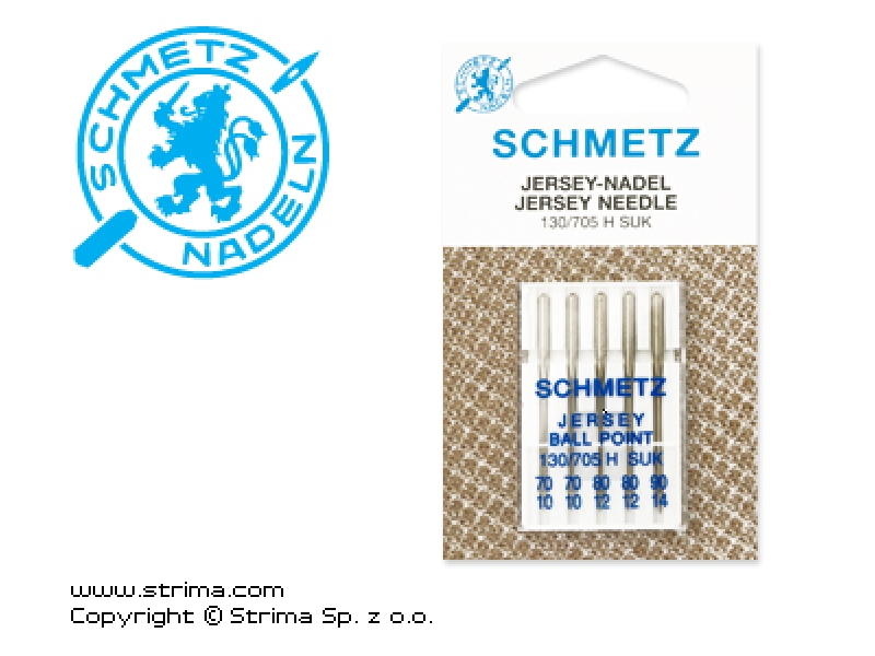 Univesální jehly SCHMETZ - 130/705H-SUK, síla 2x70, 2x80, 1x90. Jehly s kuličkou mají kulatější hrot, který zabraňuje tečení ok a trhání vláken úpletu, neboť prochází mezi vlákny.Pro lepší orientaci jehel pro domácí šicí stroje jsou jehly SCHMETZ takto označeny- UNIVERSÁL (STANDARD)- bez značek, BALL POINT (kulaté hroty- pro jersey a pleteniny)-bez označení, STRETCH- žlutá barva, JEANS/DENIM- modrá barva, MICROTEX (pro kepr a hedvábí)- fialová barva, EMBRODIERY ( pro vyšívání)- červená barva, QUILTING ( pro patchworks)- zelená barva, SP SUPER STRETCH- oranžová barva.