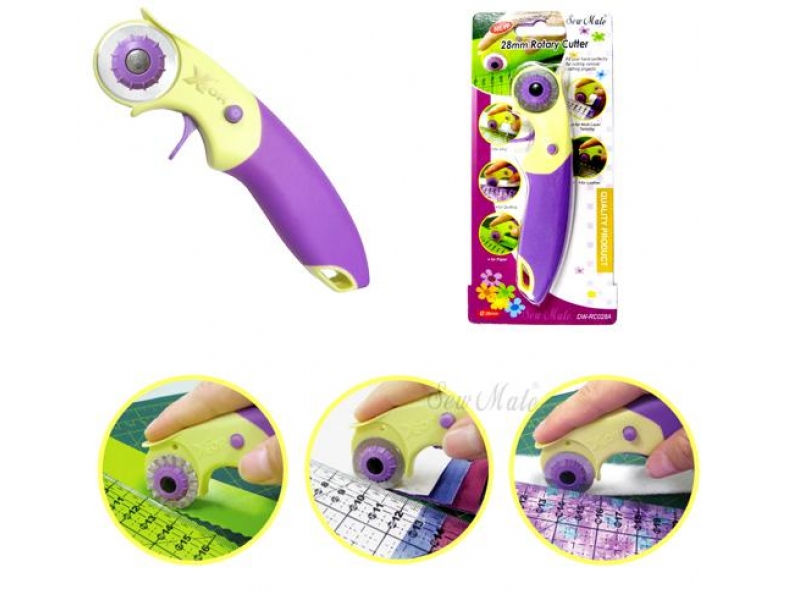 Řezací kolečko na patchwork. Kruhový řezač má velmi pohodlnou měkčenou rukojeť umožňující komfortní stříhání jak pro leváky tak pro praváky. Nechybí pojistka k zablokování zasunuté nebo vysunuté čepele. Lze použít pro pravou i levou ruku. Průměr kolečka 28mm. Kolečko je rovné z velmi kvalitní oceli s karbonem- dlouhá životnost. K tomuto kolečku můžete dokoupit také kolečka s vlnkou, skip atd. nejsou ale součástí balení.
