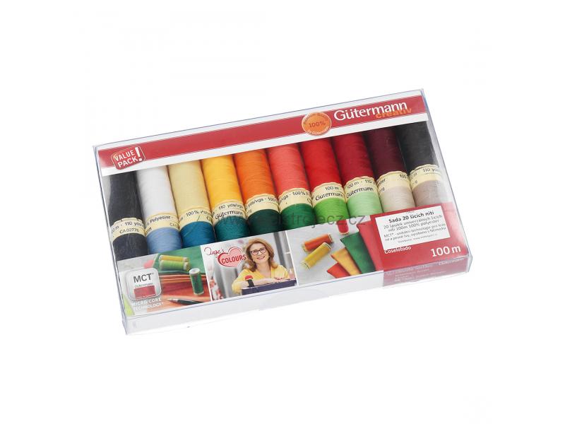 Zvýhodněná sada 20 špulek univerzálních šicích nití Gütermann (100% polyester) v návinu 100 m v základních barvách.
