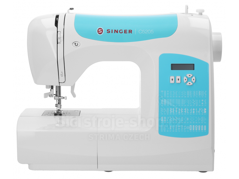 Šicí stroj Singer C5205 - TQ (Tyrkysová) je elektronický šicí stroj s displejem pro domácí šití. Stroj je vybaven kovovým kyvným chapačem, 80 druhy stehů, 6 typy automatické knoflíkové dírky i automatickým navlékačem jehly. Stehy, délka a šířka stehu se regulují jednoduše pomocí tlačítek. Praktické volné rameno umožňuje pohodlné šití i kruhových tvarů. Kvalitní LED osvětlení osvětluje pracovní plochu bez stínů. Pevný kovový rám zaručuje stabilitu při šití. Součástí je praktický přídavný stolek rozšiřující pracovní plochu.