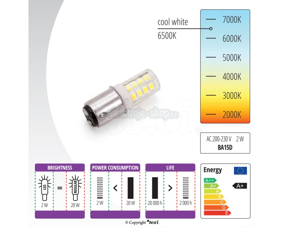 Žárovka TEXI LED B15 D je moderní zdroj světla, určený pro domácí elektrospoteřbiče jako jsou šicí stroje, ledničky atd. Žárovka má příkon pouhé 2W, ale výkon odpovídá 20W žárovce. Běžná žárovka má příkon a výkon 15W, takže nejen máte úsporu el. energie , ale získáte lepší kvalitu osvětlení, které je silnější a má jiné lepší spektrum, takže látka při šití vypadá opravdu jak má. Další výhodou je, že diody nevydávají mnoho tepla, takže se vám nestane, že byste mohli vypálit závit- patici žárovky. Někdy se totiž ve snaze dát do spotřebiče silnější zdroj světla stává, že žárovka není vhodná a poškodíte patici spotřebiče a vypálíte si v plastech nehezký tvar.