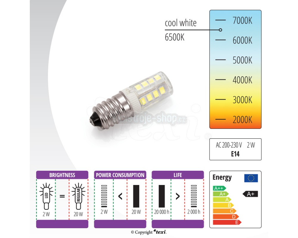 Žárovka TEXI LED E14 je moderní zdroj světla, určený pro domácí elektrospoteřbiče jako jsou šicí stroje, ledničky atd. Žárovka má příkon pouhé 2W, ale výkon odpovídá 20W žárovce. Běžná žárovka má příkon a výkon 15W, takže nejen máte úsporu el. energie , ale získáte lepší kvalitu osvětlení, které je silnější a má jiné lepší spektrum, takže látka při šití vypadá opravdu jak má. Další výhodou je, že diody nevydávají mnoho tepla, takže se vám nestane, že byste mohli vypálit závit- patici žárovky. Někdy se totiž ve snaze dát do spotřebiče silnější zdroj světla stává, že žárovka není vhodná a poškodíte patici spotřebiče a vypálíte si v plastech nehezký tvar.Technické parametry: