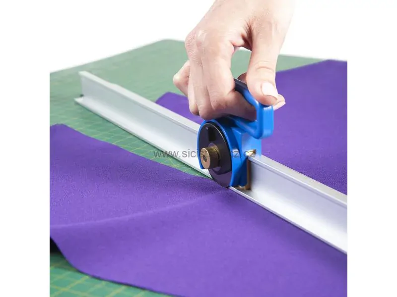 Hliníkové přesné pravítko se zabudovaným nožem na pojezdové liště. Je určen pro řezání textilu, pleteniny, papíru, kůže, vinylu atd. Umožní prořez více vrstev materiálu a maximální síle 5 mm. Součástí řezací lišty je řezací kolečko o průměru 45 mm, velmi vysoké kvality. Řezací kolečka lze měnit za různé typy jako cik cak atd.
